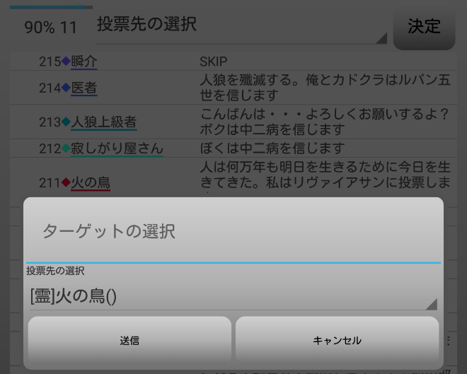 瞬介「村陣営と歩調を合わせるために火の鳥(霊ロラ)投票の意思を示そう。俺は『火の鳥へ投票をします!』」
