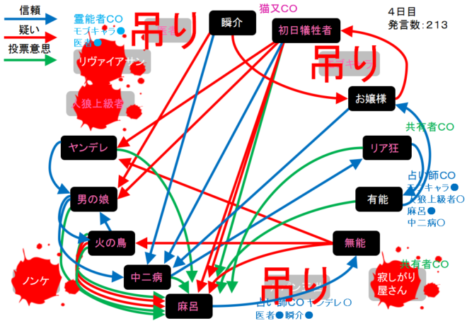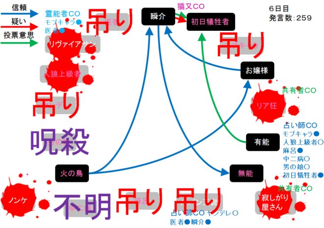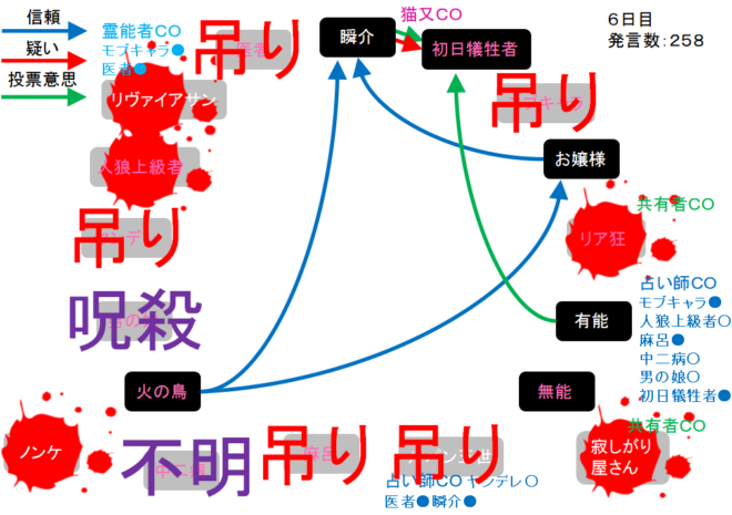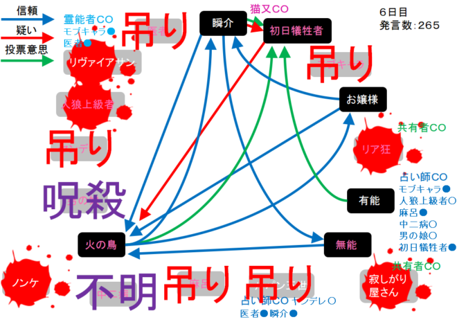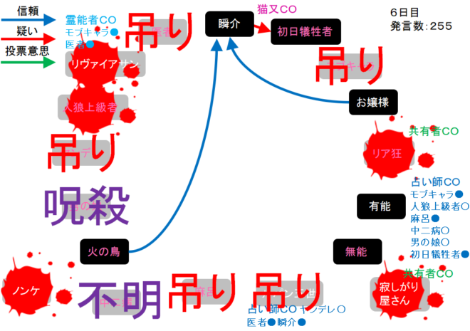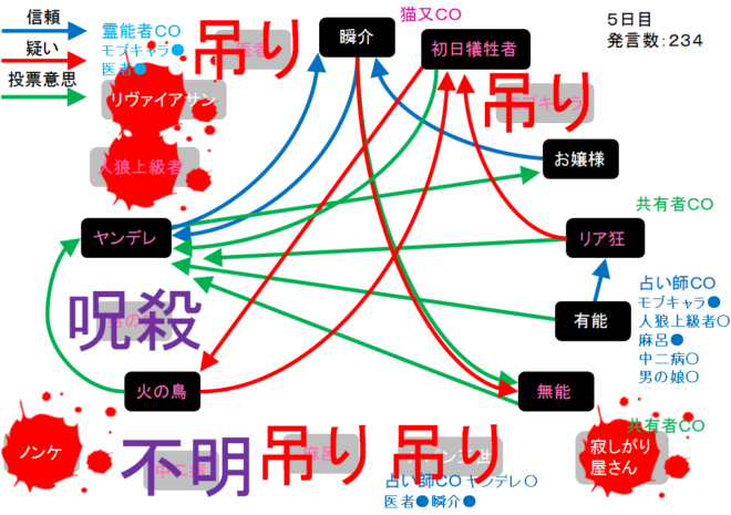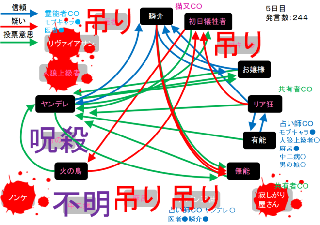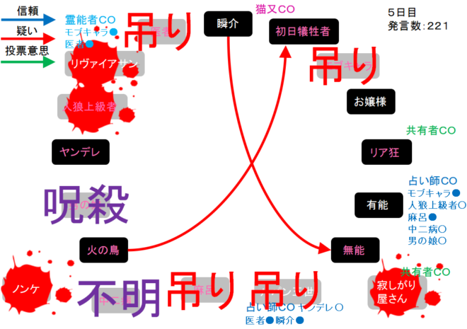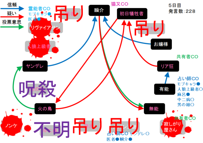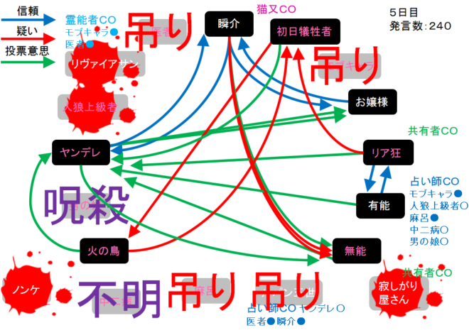 瞬介「5日目を開始する準備ができました(上の図)!それでは!LWを処刑して妖狐勝利になったら悔しすぎる。5日目よ来い来い!そいっ!」