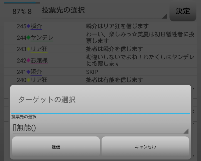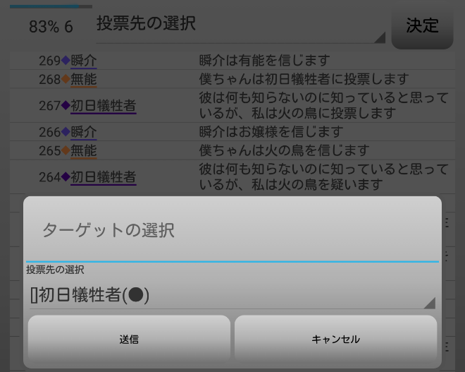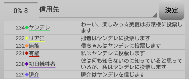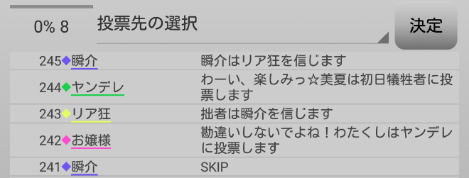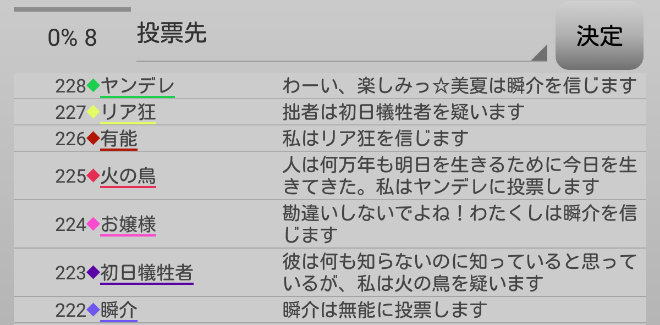 今日はこのまま初日犠牲者に投票だ。俺は『初日犠牲者に投票します!』」