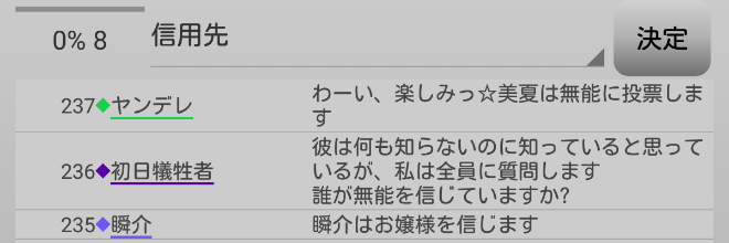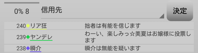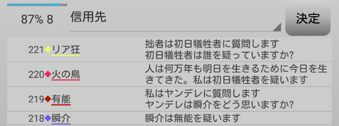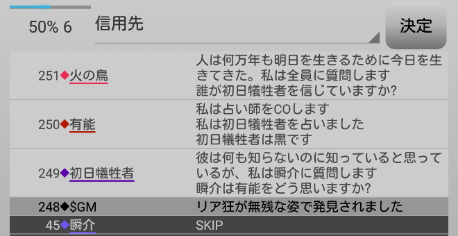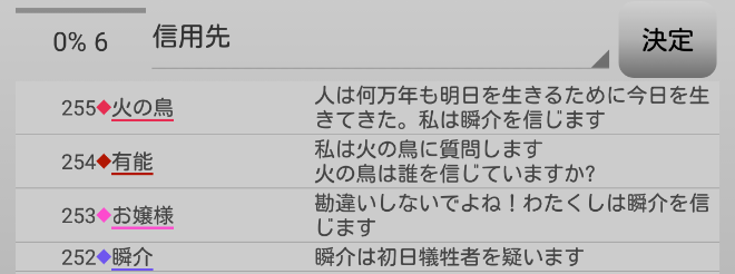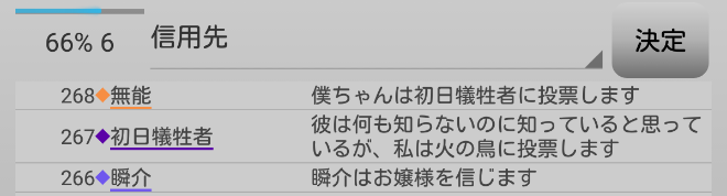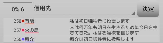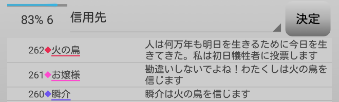 瞬介「議論が止まってしまった。怖いから他のプレイヤーも信頼しよう。俺は『火の鳥を信頼します!』」