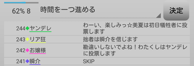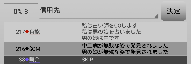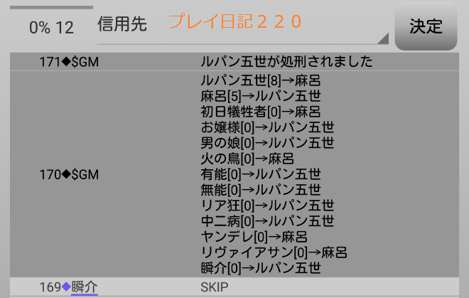 瞬介「初日犠牲者に3票が集まった。もう発言する意味はないだろう。疲れたので!『スキップ』します!」