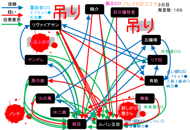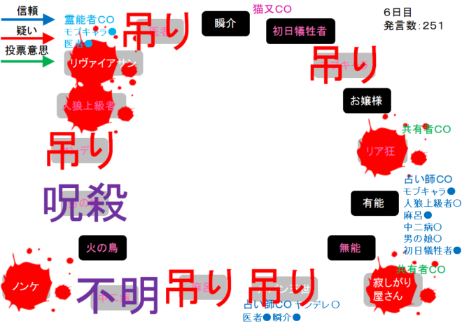 瞬介「参考にするべきは3日目の投票結果と発言表だ。つまりルパン(破綻占い師)投票か麻呂(●持ち)への投票で真っ二つに割れた日だね」