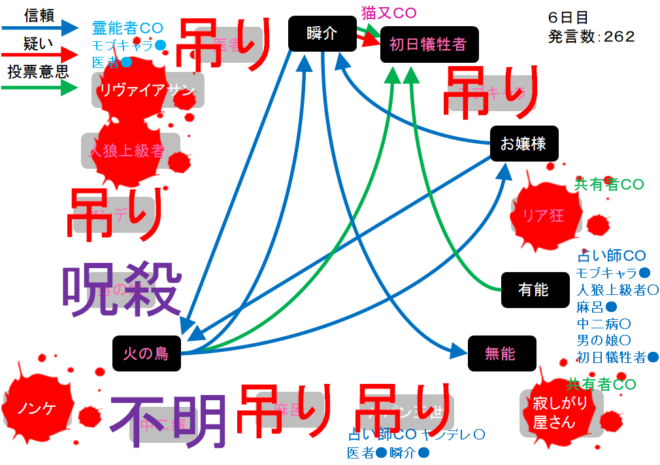瞬介「リア狂(共有者)と火の鳥が初日犠牲者を疑っている。奴も占い師を疑っていたから怪しいけど・・・狩人がいない場合、占い師が退場をしてグダグダになるかも」