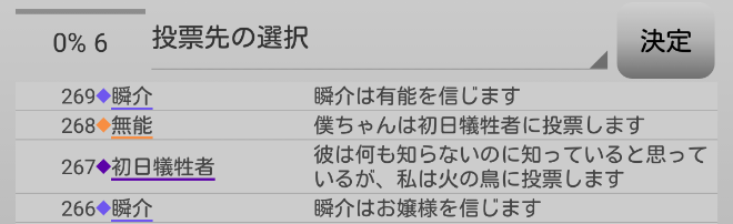 瞬介「議論はこれで終わり。投票の時間になります。『無能へ投票をしよう』。占い師の注意を引きつける意味でね」