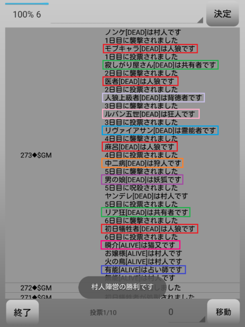 真役職者の役欠けなし→狂人の●誤爆→狂人が猫又に●出し→真占い師の呪殺と、これ以上ないくらい理想的な展開でした。狂人が村人に●を出していたら負けていたかも。
