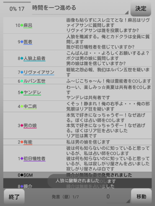 瞬介「人狼に襲撃されて死んだ(上の図)。無能の占い結果は●でした。襲撃されなければ勝てたかもしれないのに!くやしい!」