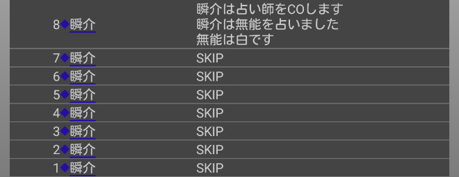 瞬介「この2人以外に票が集まっていないという事情もある。最後の発言になります。意思は示したので『スキップ』します」