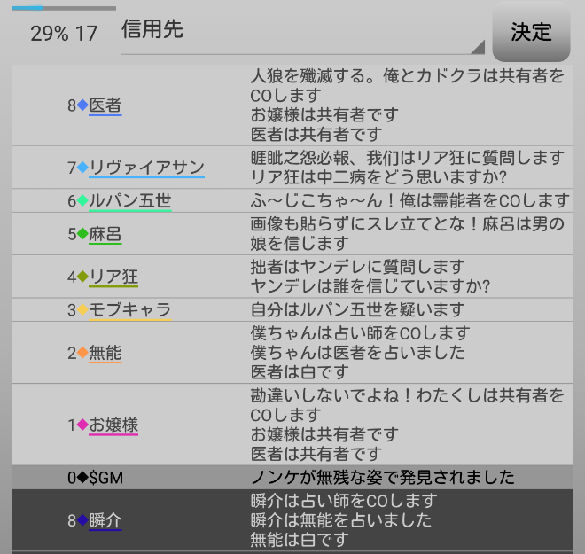 瞬介「無能(俺の○)が医者○で占い師COをした。医者は共有者だ。グレーの人数が多すぎる」