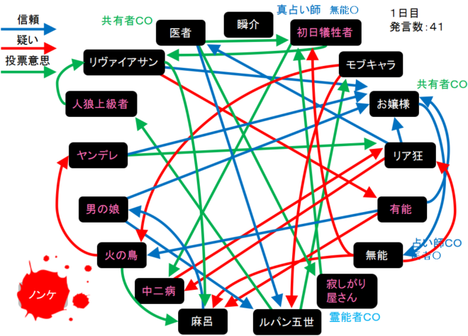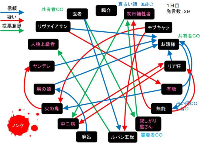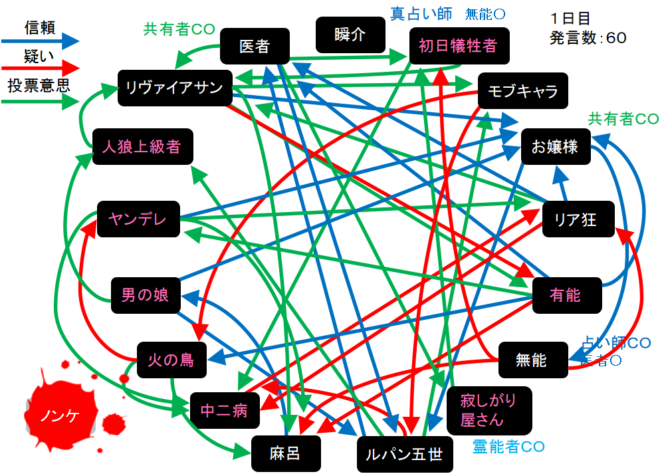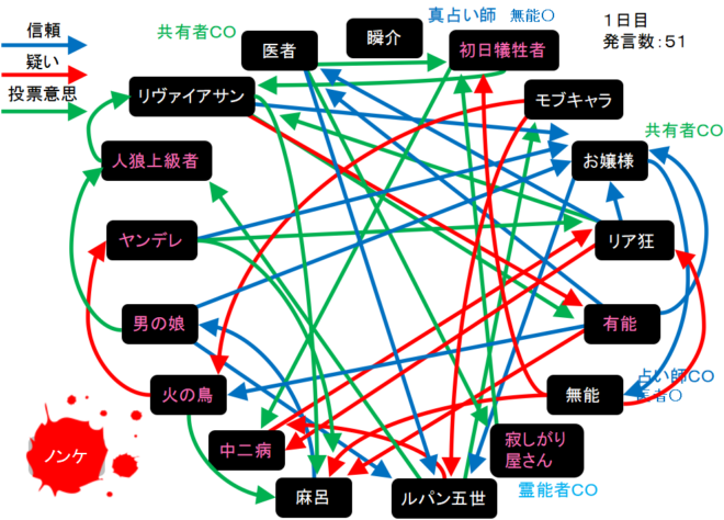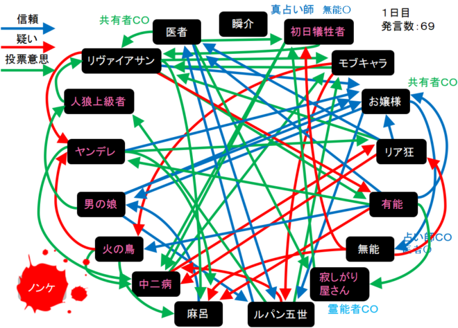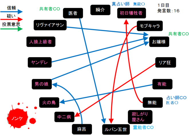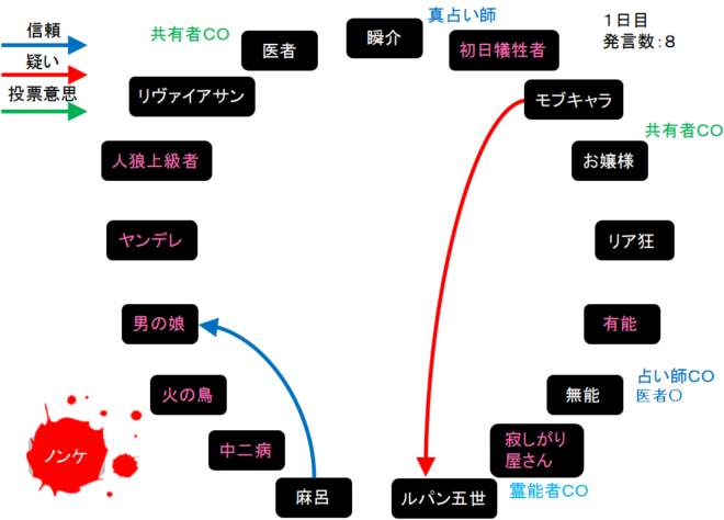 瞬介「無能の占い結果は○だった(上の図)!それでは!さっきの無能●はもったいなかった(泣)。1日目よ来い来い!そいっ!」
