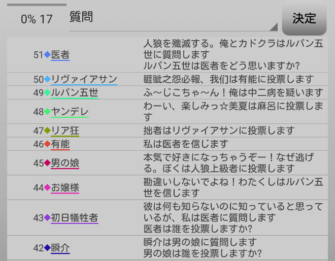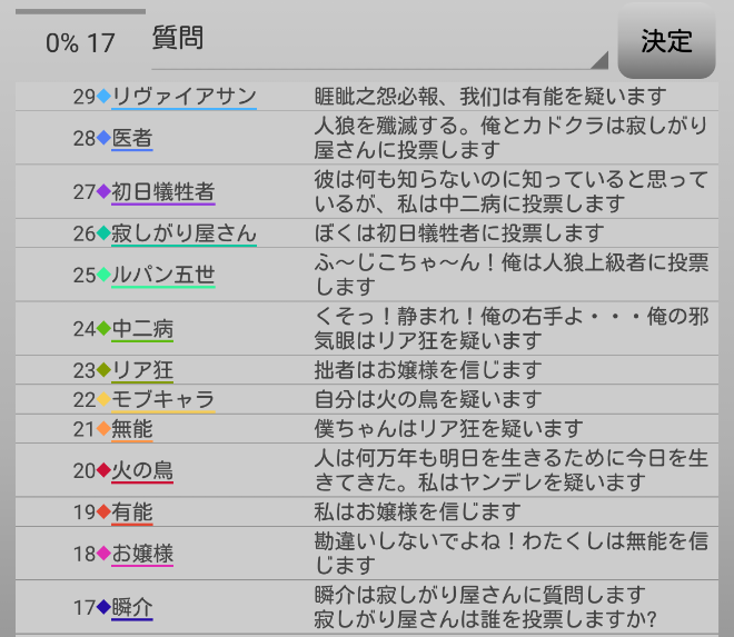 瞬介「今日はグレランだ。なるべく再投票をめざしたい。潜伏気味なプレイヤーから投票先を質問しよう。『寂しがり屋さんは誰に投票しますか?』」