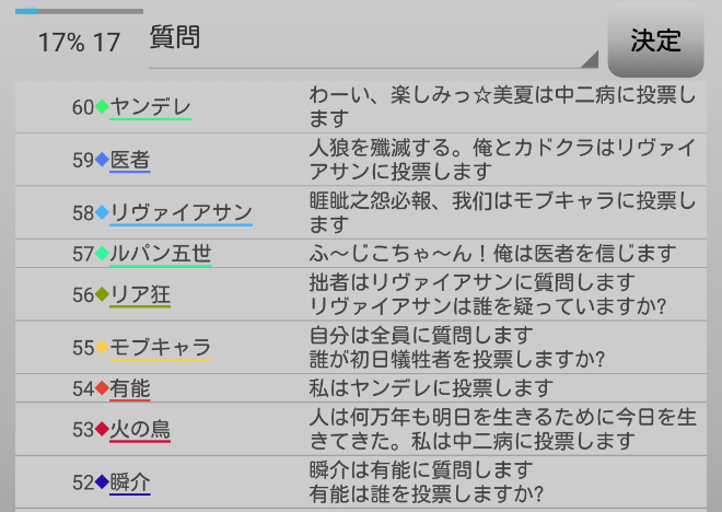 麻呂かリヴァイアサンが処刑されそうな気がする。嫌な流れだ。静かにしている有能さん!『有能は誰に投票をしますか?』。