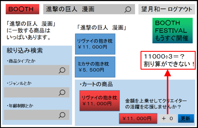 瞬介「リヴァイの抱き枕にも金額を上乗せしよう。俺は『価格÷3』の金額をブーストすることにしている。だから『11000÷3』を計算する必要があるんだけど難しいな。11000÷3の答えなんてわからないぞ」