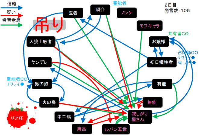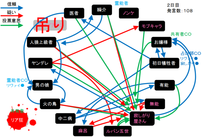 明日、呪殺が出れば勝てるかな。俺が噛まれたら戦犯だろう(笑)。事情により2日目の投票結果で投稿を中断します。申し訳ありません。