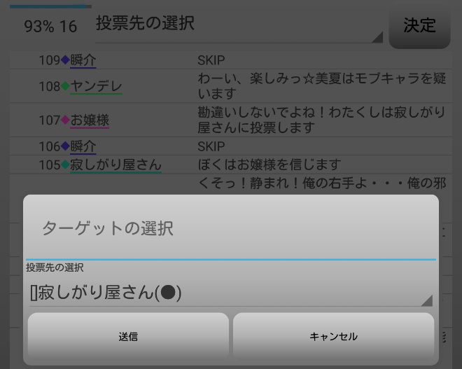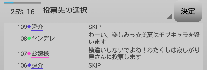 瞬介「残りの吊り回数は7回?今回も勝てるんじゃないの?寂しがり屋さんへ投票宣言をしようぜ。俺は『寂しがり屋さんへ投票します!』」