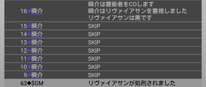 瞬介「信頼できる奴がいないんだよなあ。男の娘は偽霊能者だしね(笑)。発言の少ない共有者を信頼しても仕方ない。『スキップ』します」