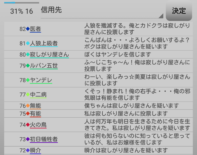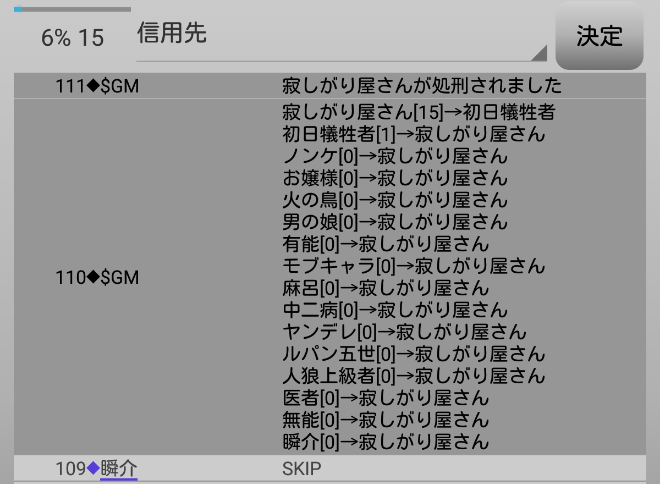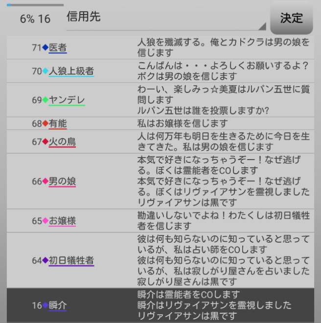 瞬介「人狼上級者が俺を信頼してくれた。潜伏霊能者でグレランを生き残るには仲間を増やした方が良いだろう。俺は『人狼上級者を信頼します!』」