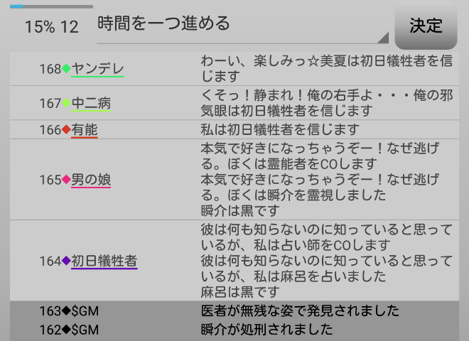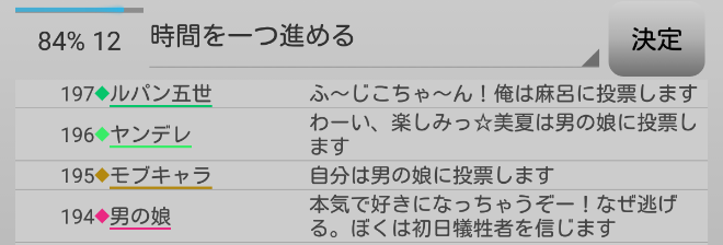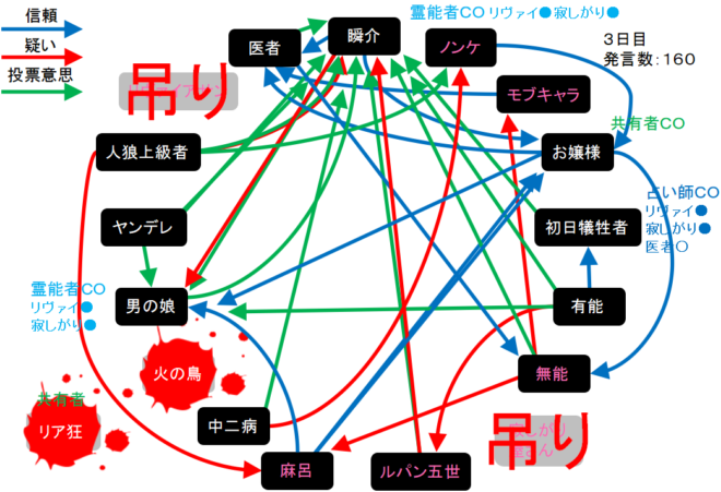 今日は霊ロラが続行されて男の娘処刑になる・・・あれ?ヤンデレが麻呂(●持ち)に投票をするみたい。どうなるんだろう。次にいきます。