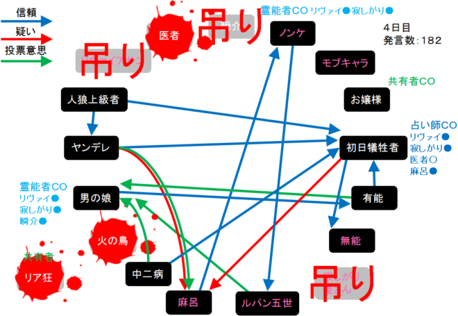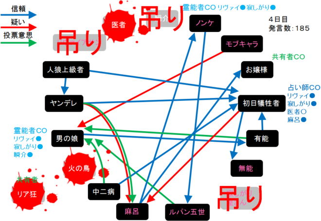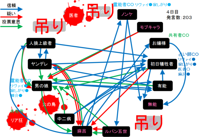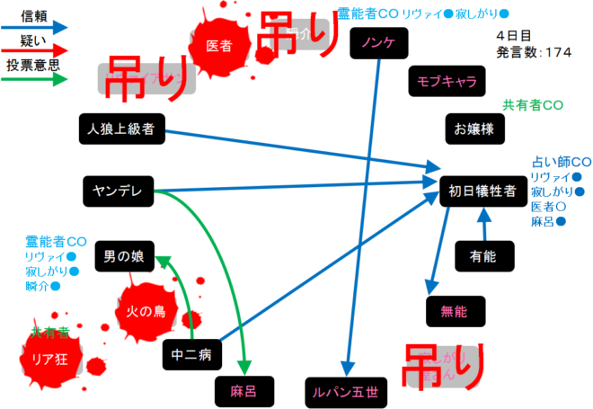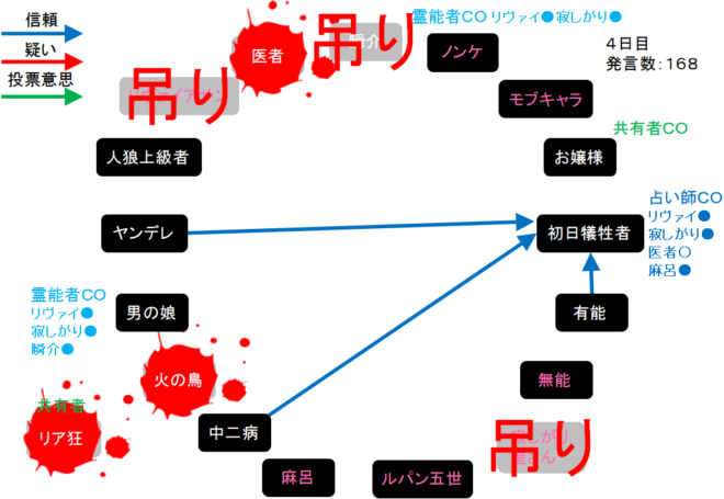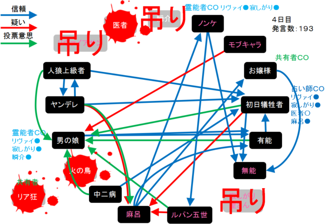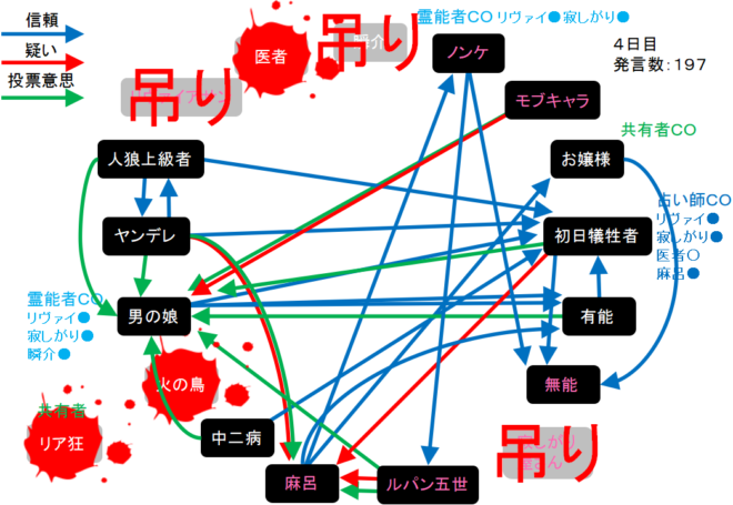 それでは!4日目は偽霊能者の男の娘を処刑してください。4日目をよ来い来い!そいっ!