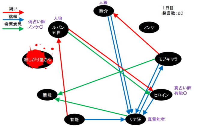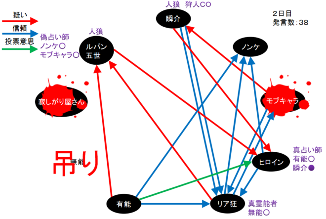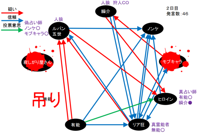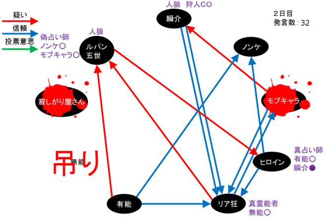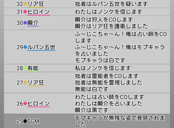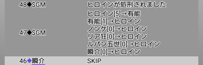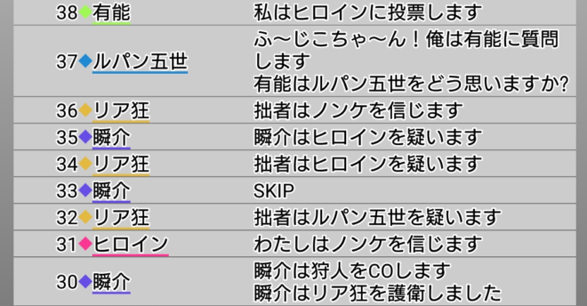 瞬介「今まで人狼を担当して疑われまくった経験と、しゃべらないノンケが次にCOするのかと思って消極的な疑い発言をしてしまった(笑)。俺視点ではヒロイン●なんだから投票宣言でも良かったなあ。またまた信頼を集めているノンケはなんなんだよ(笑)。有能がヒロイン投票へ動いたみたいだぞ。つまり有能は素村人と確定したわけだ」