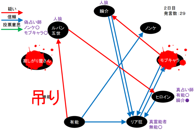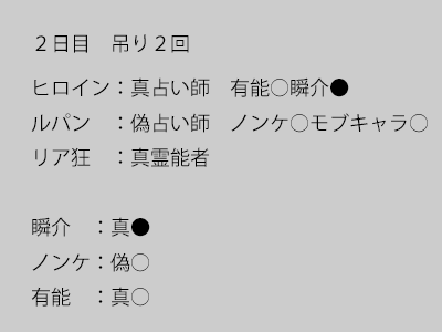 瞬介「これが当初の作戦通りであり現状のCO結果ではベストの行動(?)であろう。それじゃあ2日目を始めるよ!そいっ!」