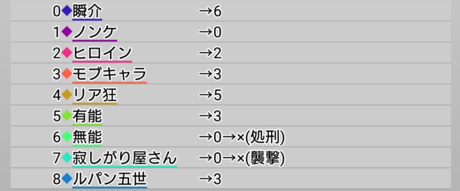 瞬介「今さら占い師や霊能者を騙るのは論外なので選ぶとしたら狩人一択だろう。村人も選べるみたいだけどCOしない狩人みたいなものだろうから選択する意味はあるのかな(笑)。有能や無能の投票先になっており村人から怪しまれているから、2日目朝に真占い師から●出しをされて狩人COすることも覚悟しなければならない。ちょいとルパンと相談してみるか」