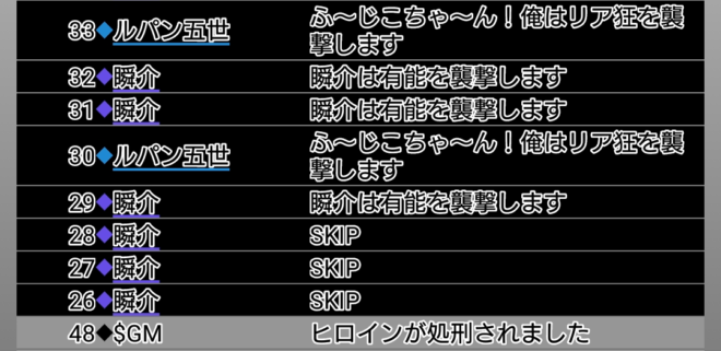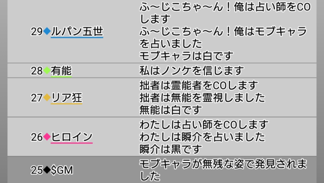 落ち着くんだ。吊りの回数はあと2回だろう?最悪、次の日の朝に俺が真占い師に●出しをされて処刑されてしまったとする。だけどルパンがいるんだし・・・あっ!3日目に真霊能者の●結果でヒロイン真占い師が確定するからルパン吊りで負けじゃないか!