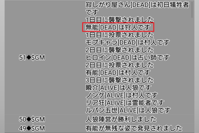ここで名乗りでなければヒロインは吊られる。真狩人に誤爆した騙り占い師だと見なされるだろうからな。有能が狩人ならばCOしているはずだ。ということは?ノンケ真狩人?いやいや真狩人ならばノンケ視点、俺●なんだからCOするだろう?えーとじゃあ有能でも同じことが言えるんだから狩人はいないの!?