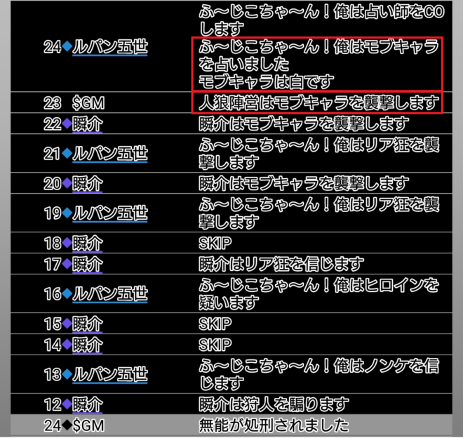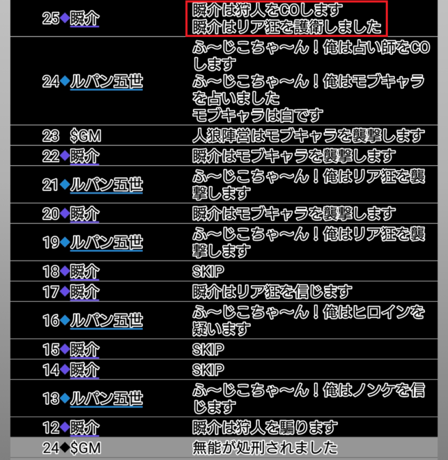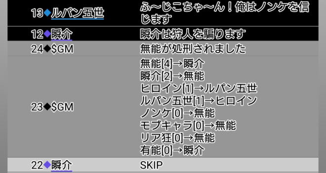 瞬介「やっとノンケがしゃべったかと思ったらルパンに告白しだした。もう奴はどうでも良いよ(笑)。真狩人がいれば出ているはずなのでCOがないかぎり投票まで『スキップ』で飛ばそう。