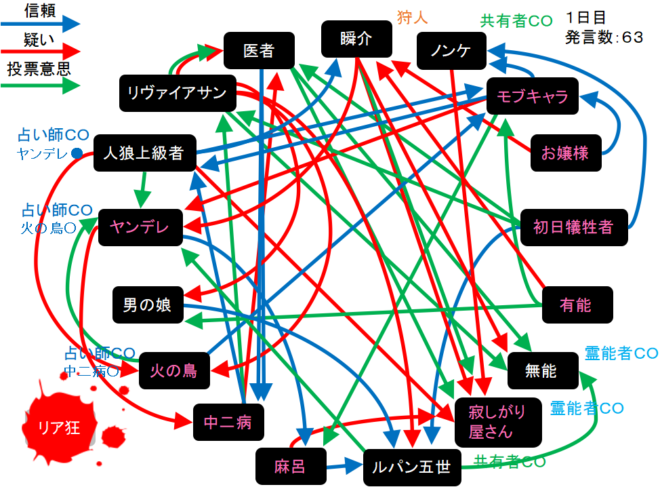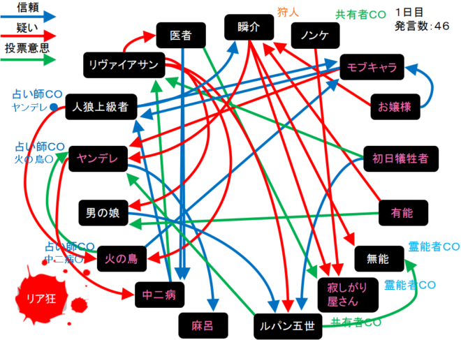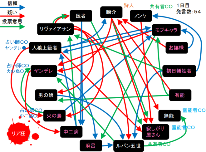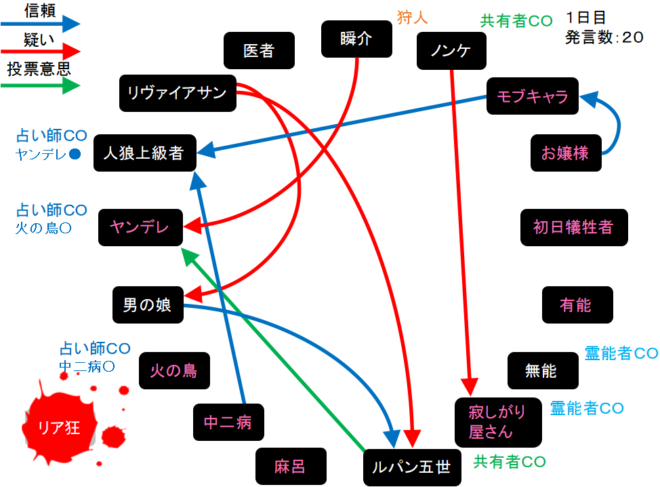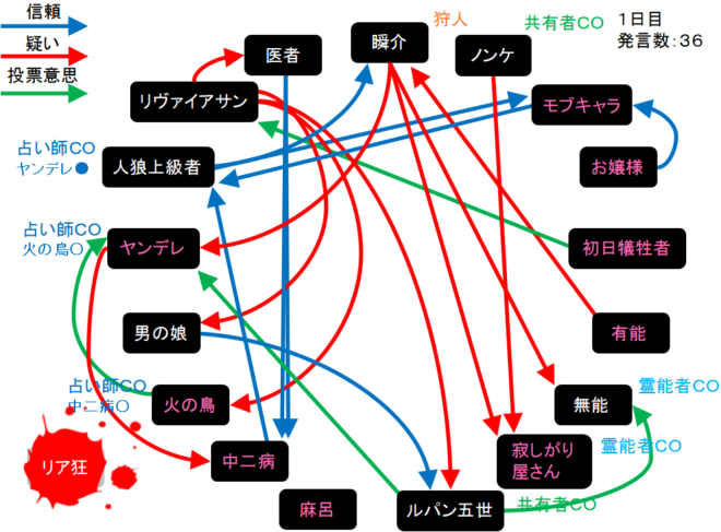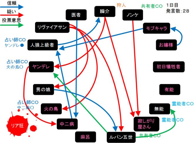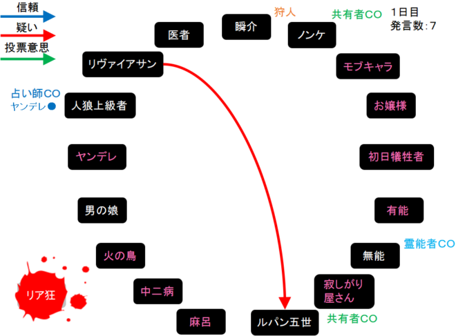 初日犠牲者がグレーのリヴァイアサンへ投票の意思を見せた。今日は霊ロラじゃないの?なぜ霊能者への投票を拒否する?