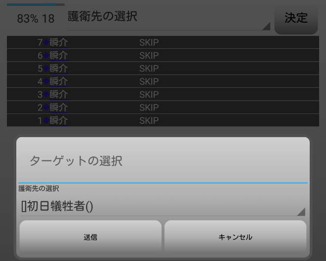 瞬介「うわっビックリした!護衛先の選択肢が出た(上の図)!初日犠牲者がランダムだから1日目に狩人は護衛先を選べるのか」