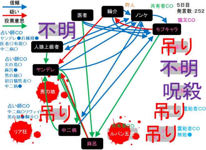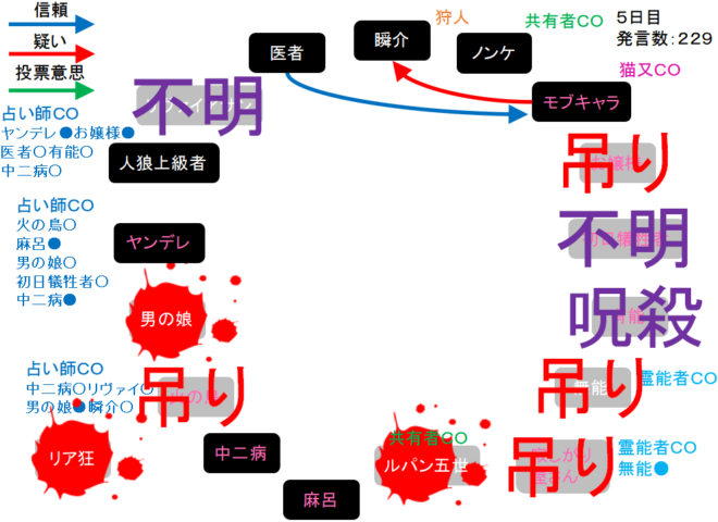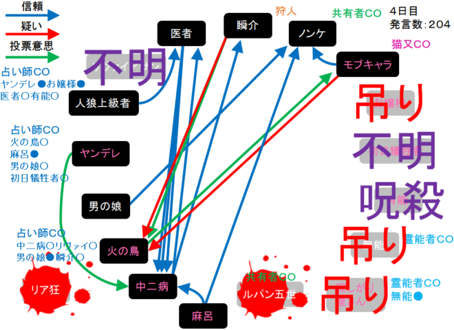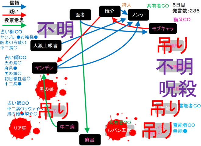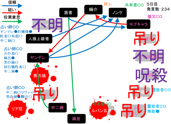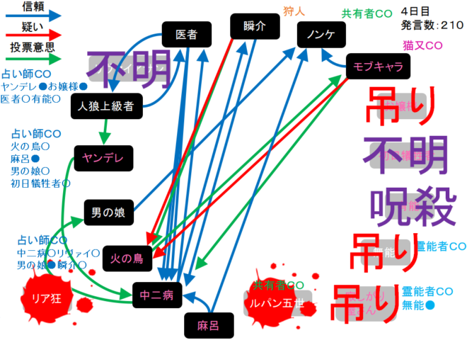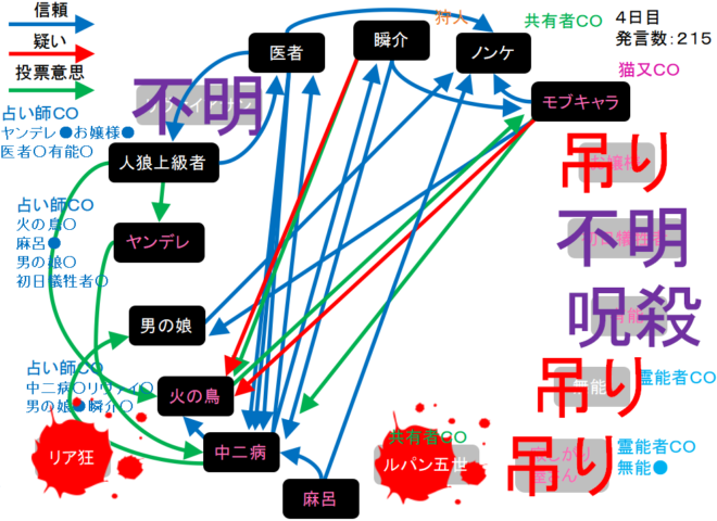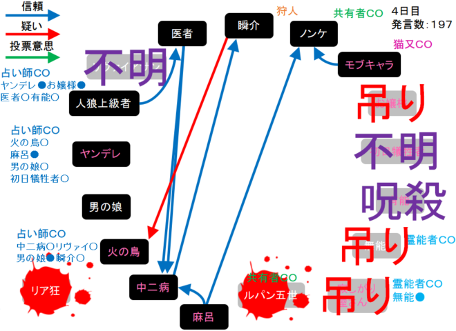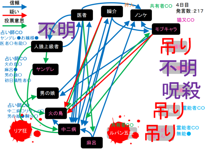 ヤンデレが火の鳥○を出している。どちらかが狂人という可能性もあるのかね。人狼上級者がヤンデレに●を出しているのを村人はどう判断するのかな。