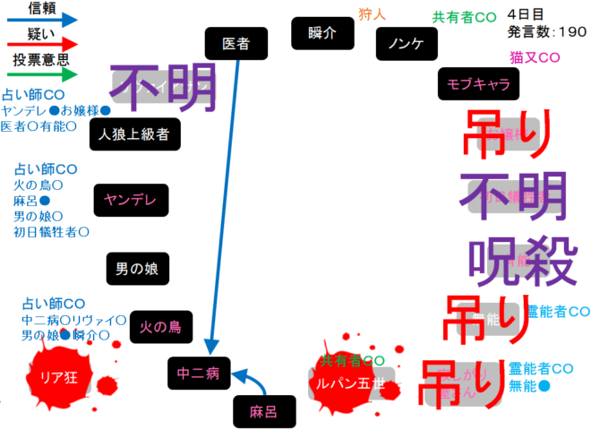 瞬介「護衛先は医者を選んだ(上の図)!それでは!狩人GJを出せれば勝てると思うんだけどなあ。4日目よ来い来い!そいっ!」