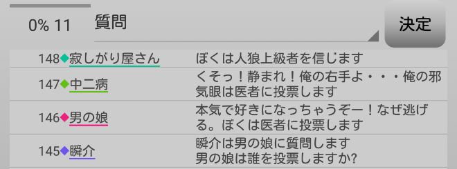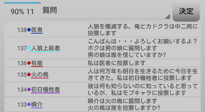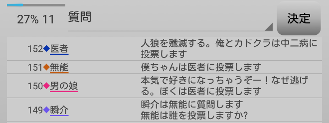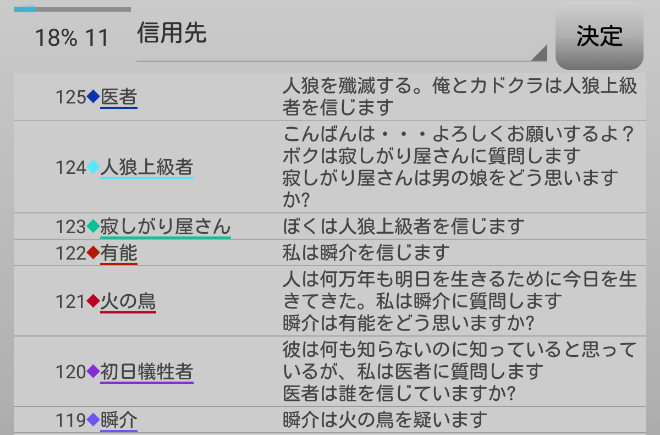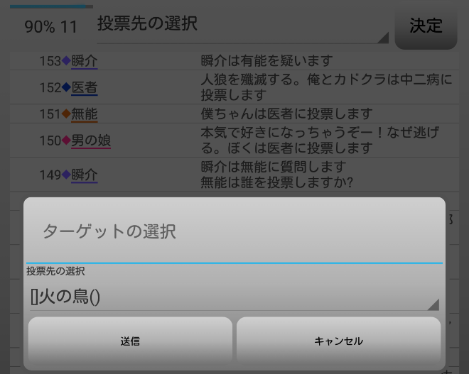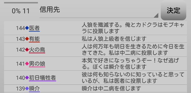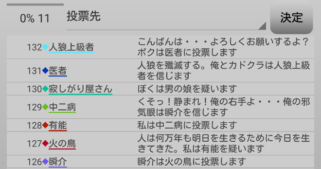 村陣営の票がバラバラになっている。もう火の鳥を人狼と決めつけて仲間を増やすしかない。俺は『中二病を信頼します!』。
