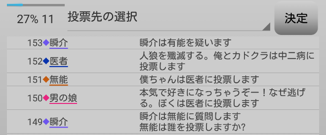 瞬介「議論はこれで終わり。投票の時間になります。悩んだけど『火の鳥に投票』をしようか。火の鳥が村陣営だったらすみません」