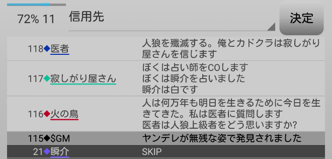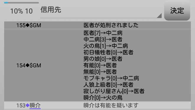 瞬介「火の鳥処刑の意思を村に示そう。人狼候補が便乗してきたら・・・火の鳥は陣営だろう。俺は『火の鳥に投票をします!』」