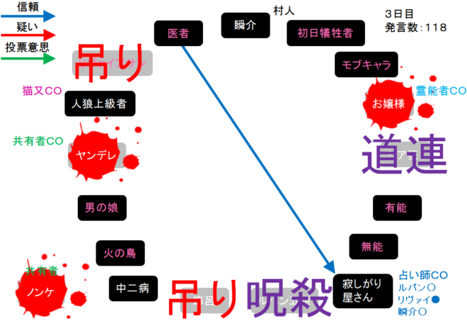 医者が処刑をされても医者へ投票した者から人狼を見つられると前向きに考えるしかないのかね。だけど3匹もいるんだぜ?