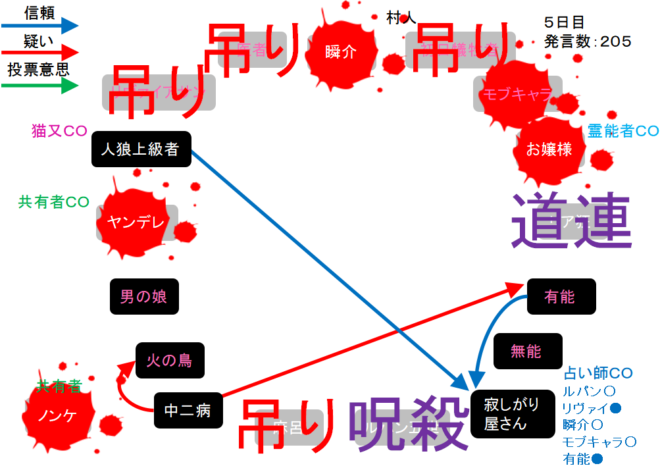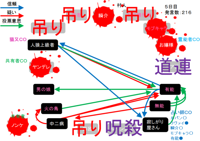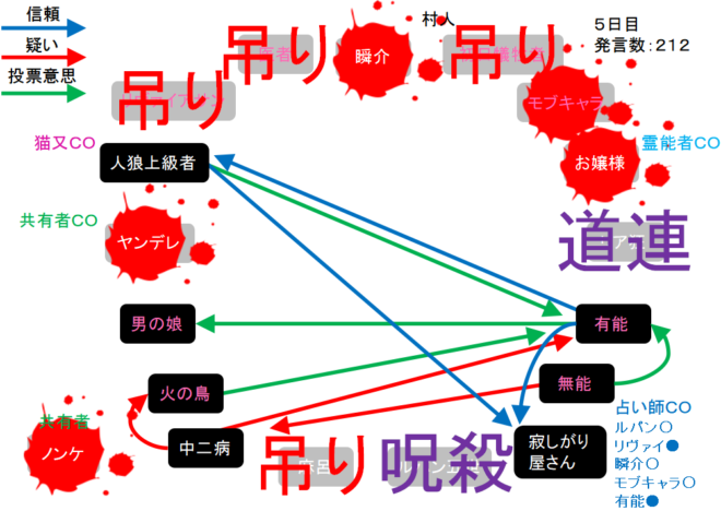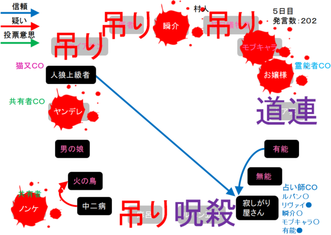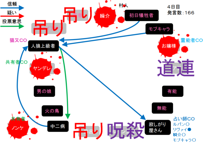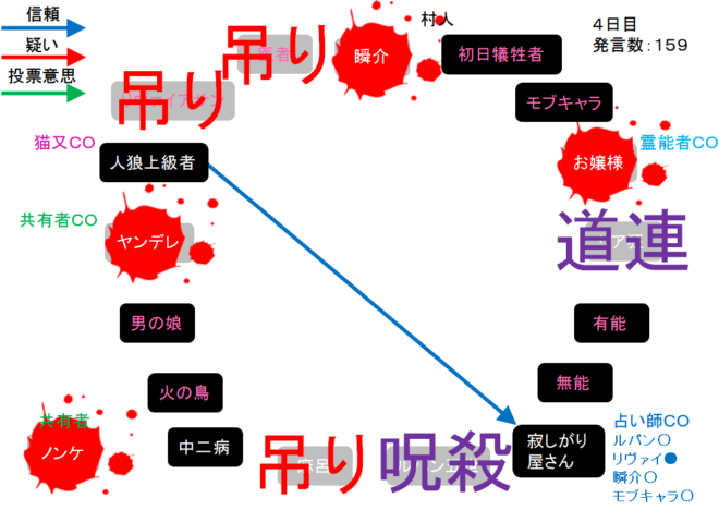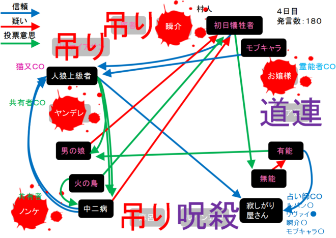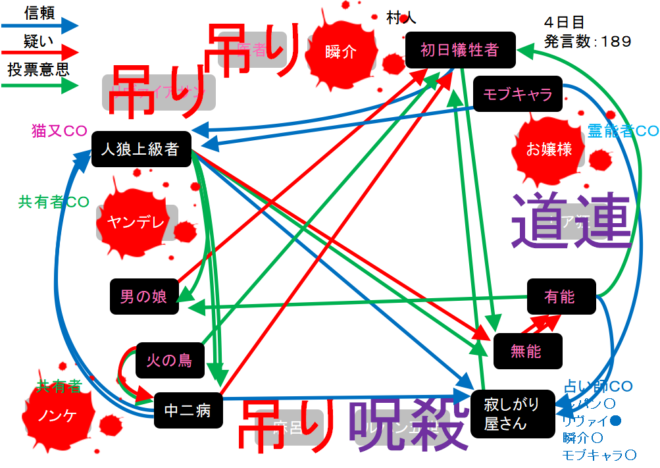 初日犠牲者が処刑をされてしまったか。やつは人狼ではなかった。明日は中二病が処刑されて人狼陣営の勝利になるのかな?それでは!5日目よ来い来い!そいっ!