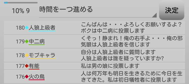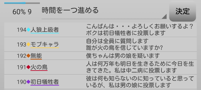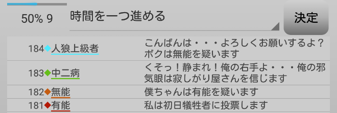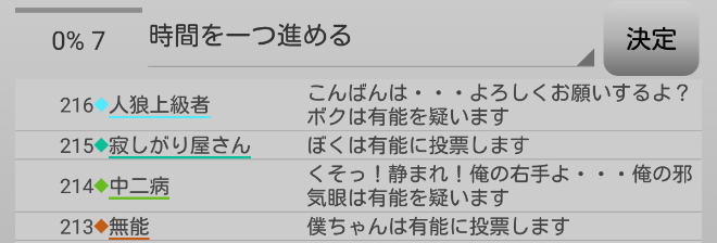 人狼に投票が集まる気配がない。人狼上級者が無能へ投票先を変えたので期待したいところだ。次にいきます。