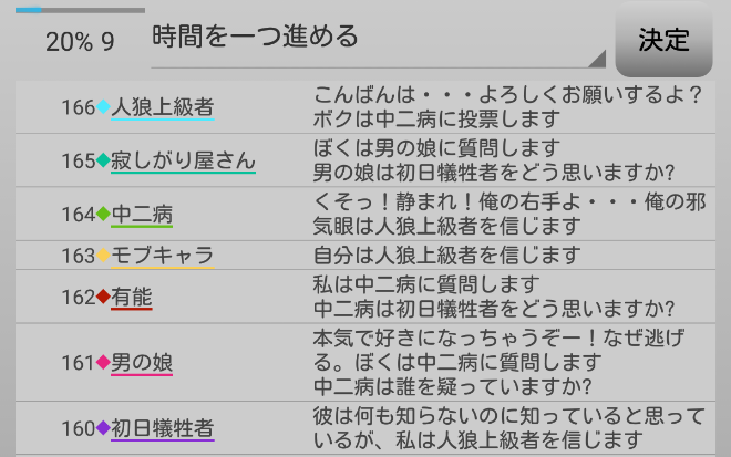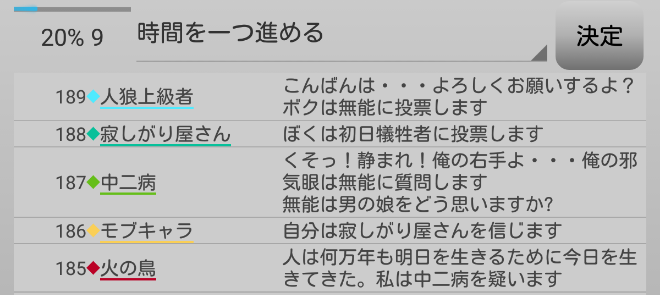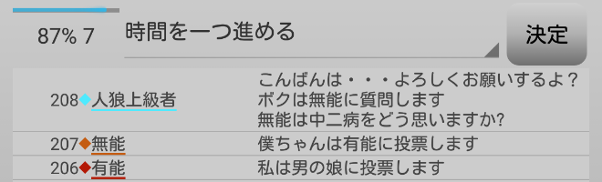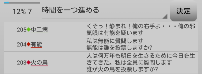投票先がバラバラになっているね。いや、中二病と男の娘が2票集めているのか。どちらかが処刑されるのかな?次にいきます。