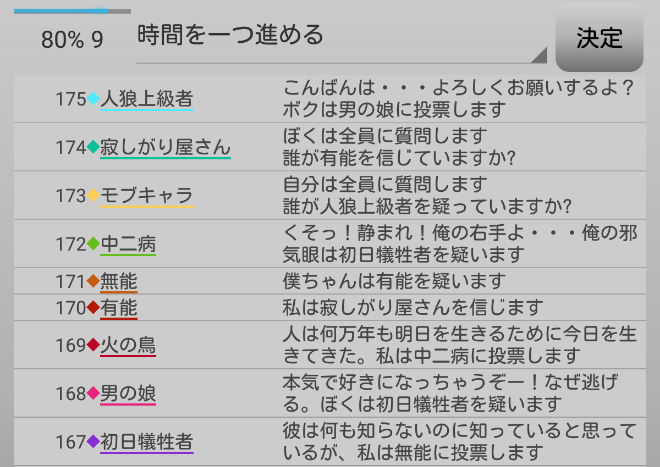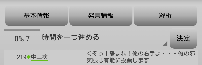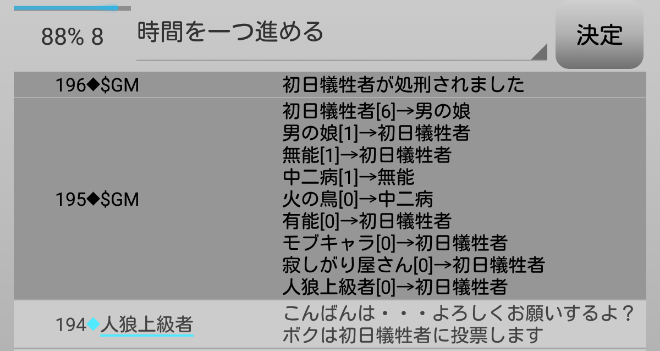 うーん、男の娘と中二病のどちらかが狩人という幸運に期待しても仕方ない。明日は中二病が処刑をされて負けるかなあ。次にいきます。