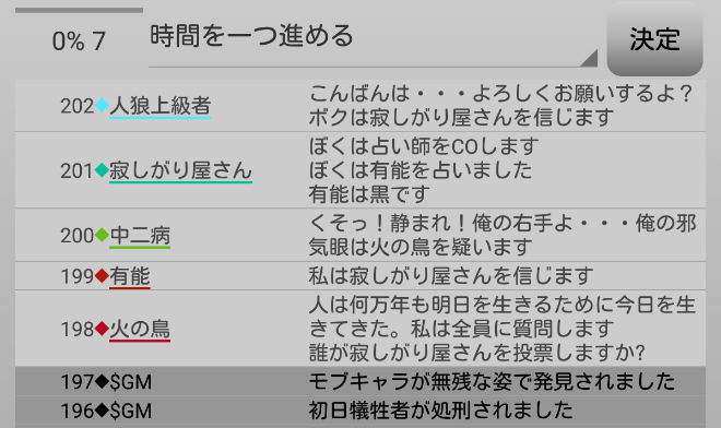 俺が噛まれてしまいました。占い結果はモブキャラ○か。中二病あたりが処刑されるんじゃないの?次にいきます。