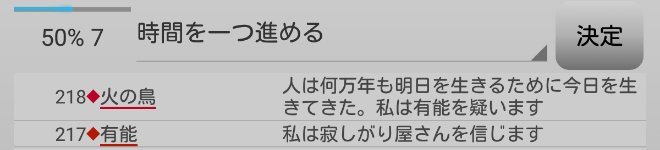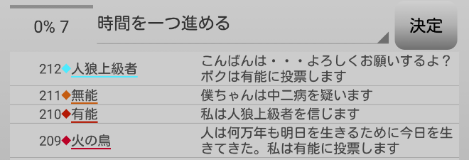 有能が男の娘へ投票意思を示した。人狼の配役は『無能●、火の鳥●、有能?●、男の娘?●』だ!火の鳥を吊れ!次にいきます。