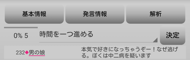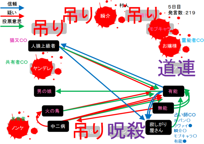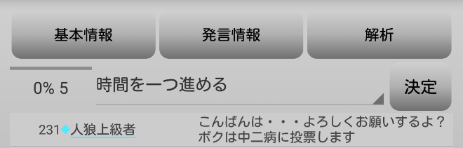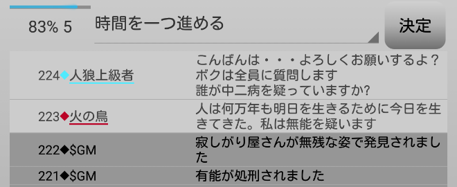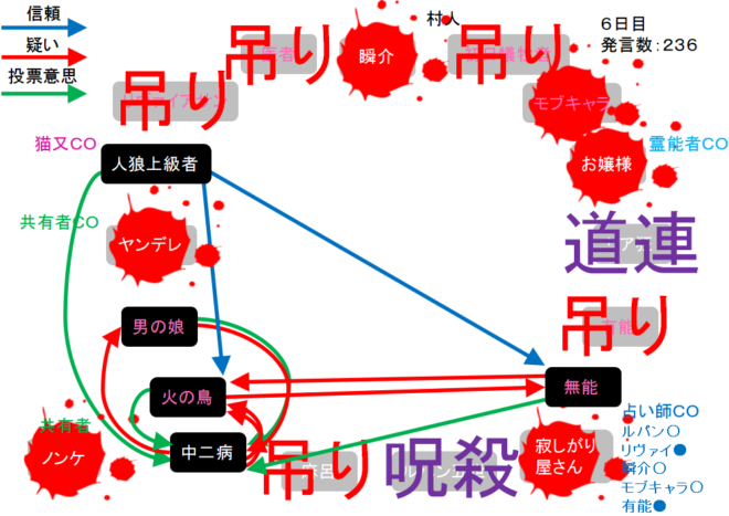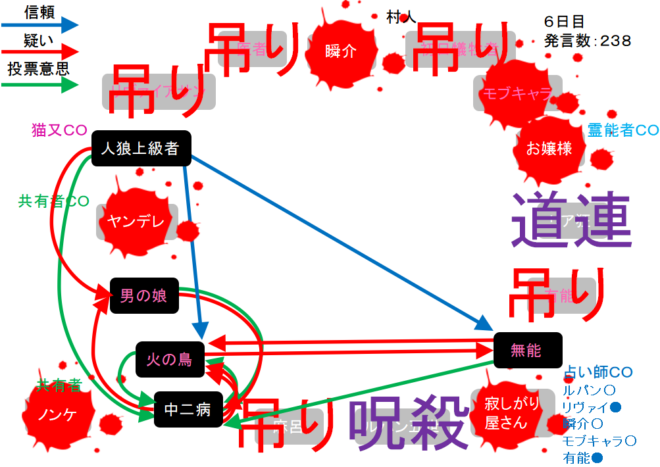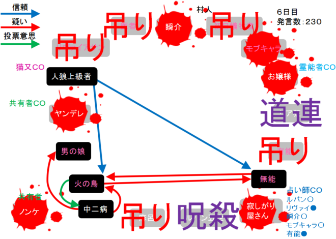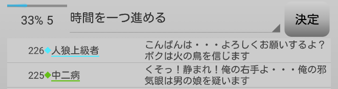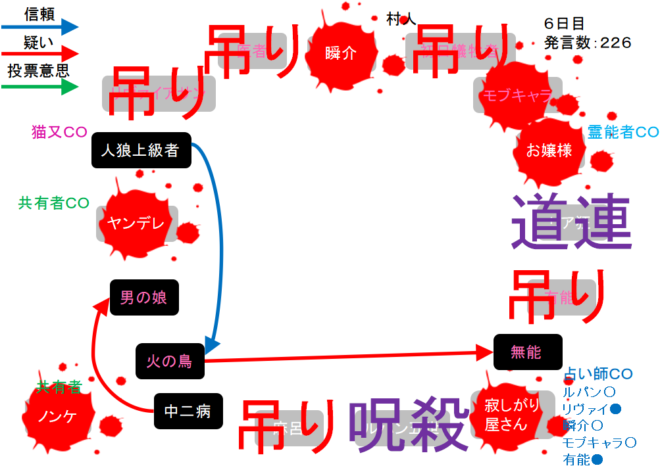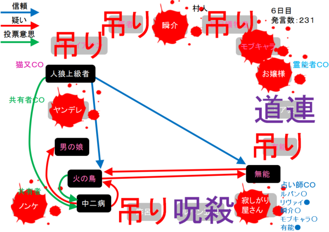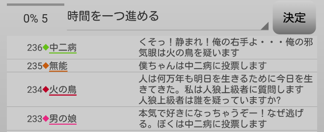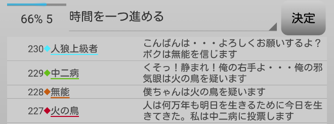 中二病は男の娘(村人)を疑っているし人狼上級者は火の鳥(人狼)を信頼している。ますいな。火の鳥に翻弄されているんじゃないの?次にいきます。