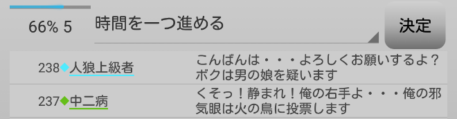 人狼同士で疑い合いつつ、中二病に投票するという流れか。うーむ、男の娘に自己主張をしてほしい。火の鳥を吊れば勝てると思うんだけど。次にいきます。