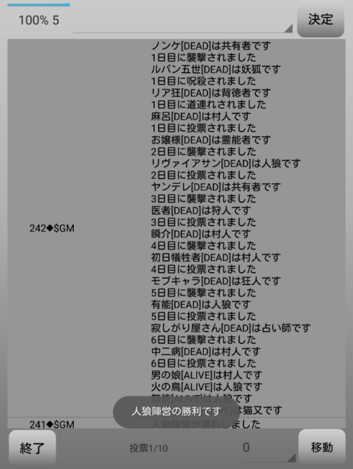 中二病が処刑をされて人狼陣営の勝利になりました。開幕呪殺は厳しい!人狼は役職者COをさせた方が処刑しやすいのですね。役欠け共有者なのも痛かった。モブキャラが狂人だったみたいだけど、なにかミスリードをしていたのかね。次回も村人を担当します。よろしくお願いします。