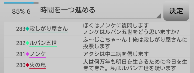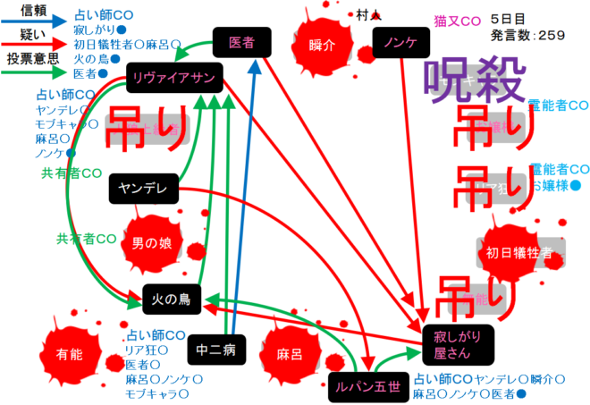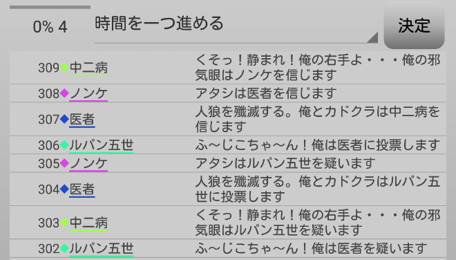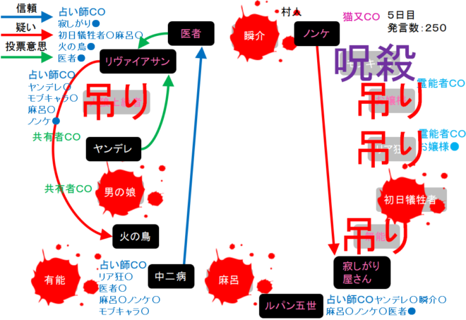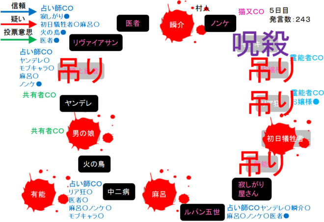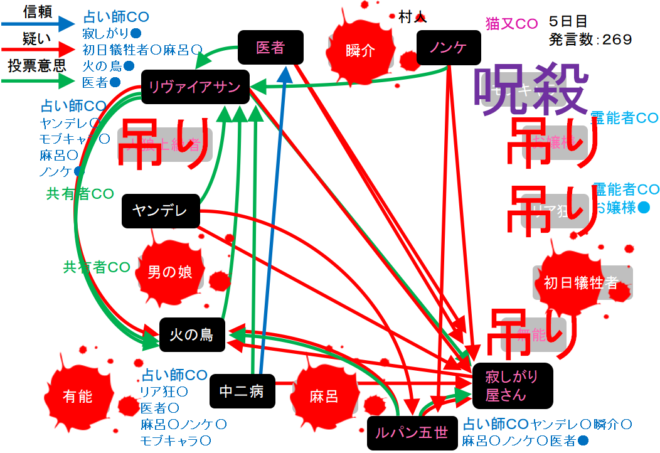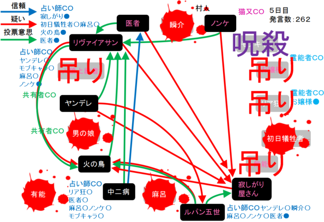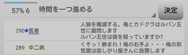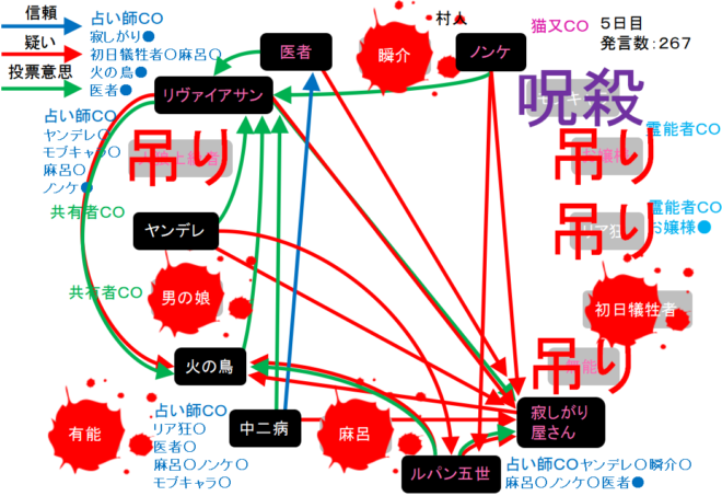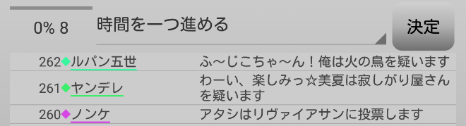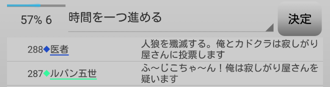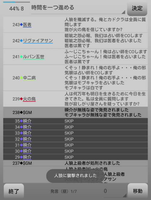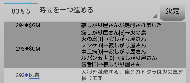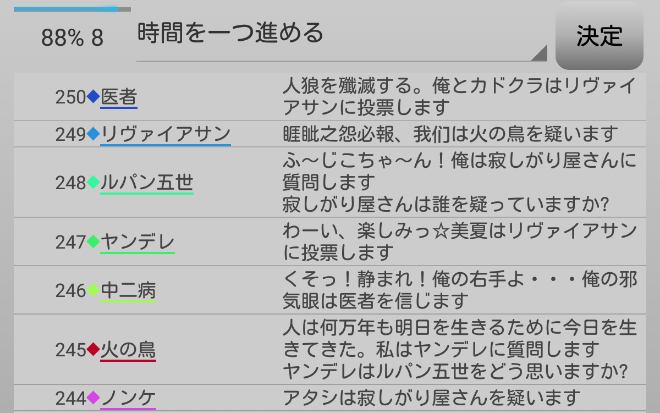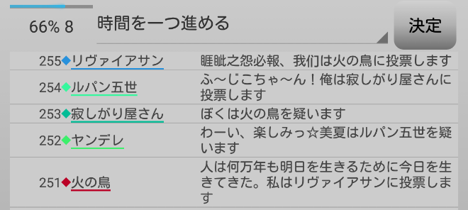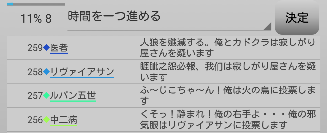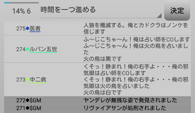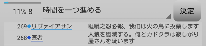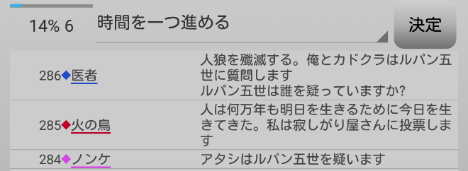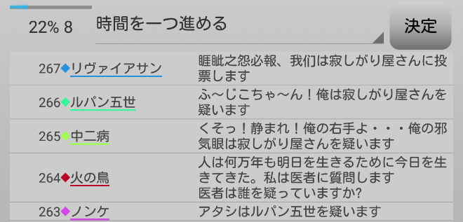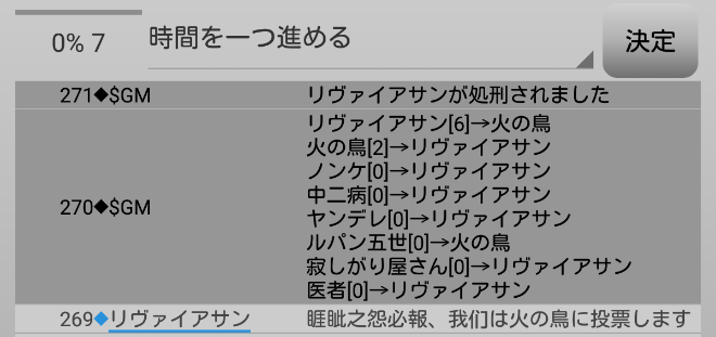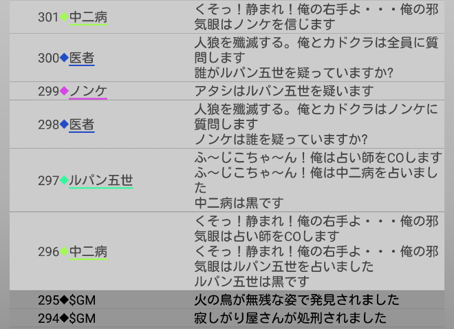 寂しがり屋さんが疑われているのは『リヴァイアサン→狂人』の可能性を考えてのことなのかな。人狼達がしきりに火の鳥を疑い続けているのはミスリード?破綻占い師の行動がわかりません。次にいきます。