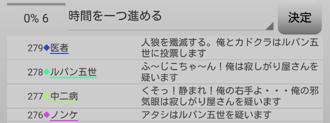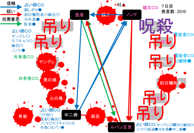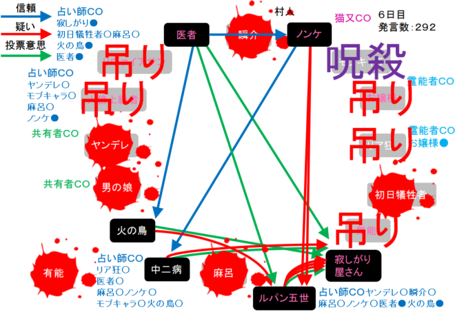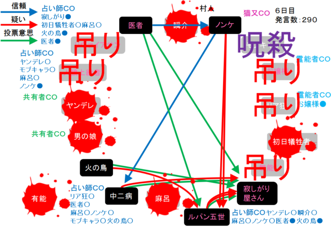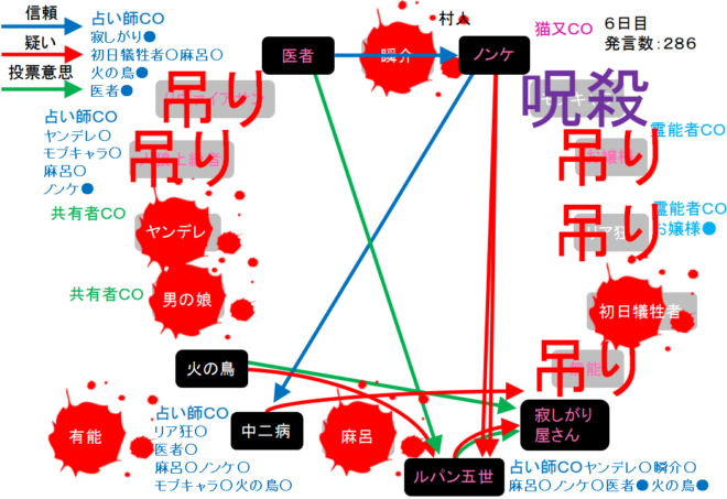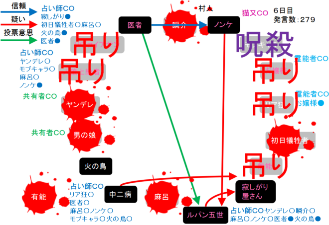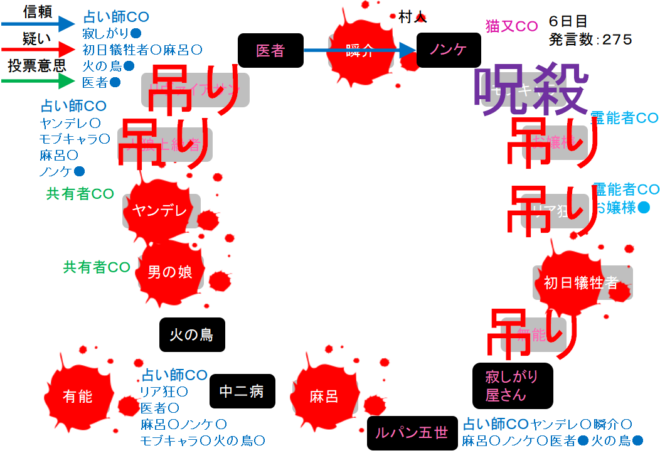 寂しがり屋さんが処刑をされました。勝負は7日目まで持ち越しです。ルパンを処刑するだけだから議論は飛ばします。それでは!7日目よ来い来い!そいっ!