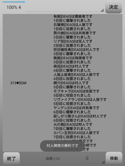 無事に勝負が終わりそうで良かった。占い師が4人になった時点で敗北するかと思ったよ。呪殺さえ出せれば勝てるから悲観しなくてもよかったのね。次にいきます。