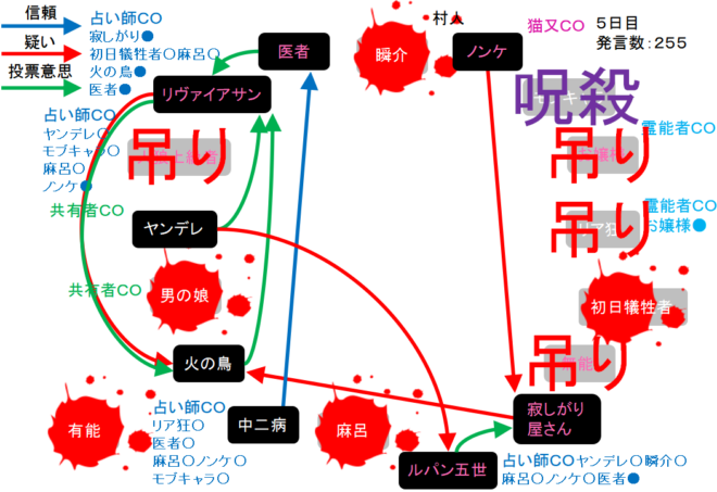 人狼のリヴァイアサンが処刑されました。順当にいけば明日の吊りはルパンになるはず。それでは!寄り道をして寂しがり屋さんとかを吊るのはやめて下さい。6日目よ来い来い!そいっ!