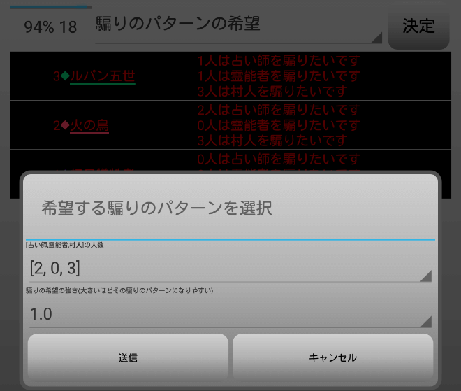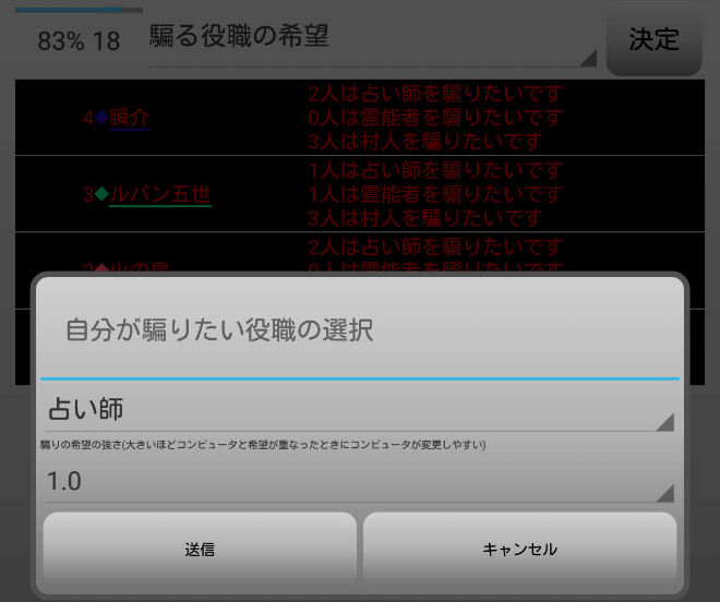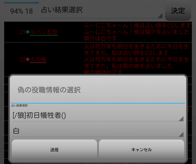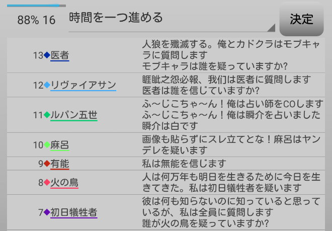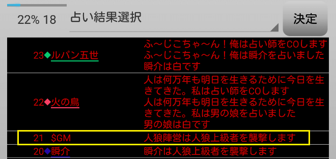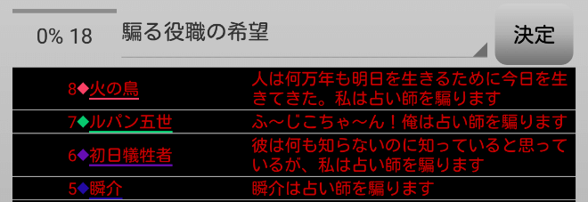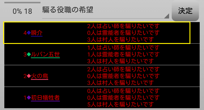 瞬介「全員が占い師を希望しているじゃねえか(上の図)!まあ上限は2人になっているから(たぶん)心配はないだろう」